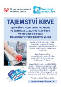 Srdečně zveme na besedu o nejdůležitější tekutině v lidském organismu, krevních skupinách, diagnostice a léčbě onemocnění krve, ale také potřebě a možnostech dárcovství. Setkání s primářkou hematologického a transfuzního oddělení Vsetínské nemocnice MUDr. Janou Pelkovou se uskuteční ve čtvrtek 22. 2. 2024 od 17.00 hodin ve společenském sále Masarykovy veřejné knihovny Vsetín. Krev zajišťuje jeden z nejdůležitějších pohybů v lidském organismu: přináší ke tkáním kyslík, odvádí oxid uhličitý, distribuuje živiny. Pohyb vnímáme jako důležitou prevenci, je pro nás také ústředním tématem letošního Roku v pohybu.