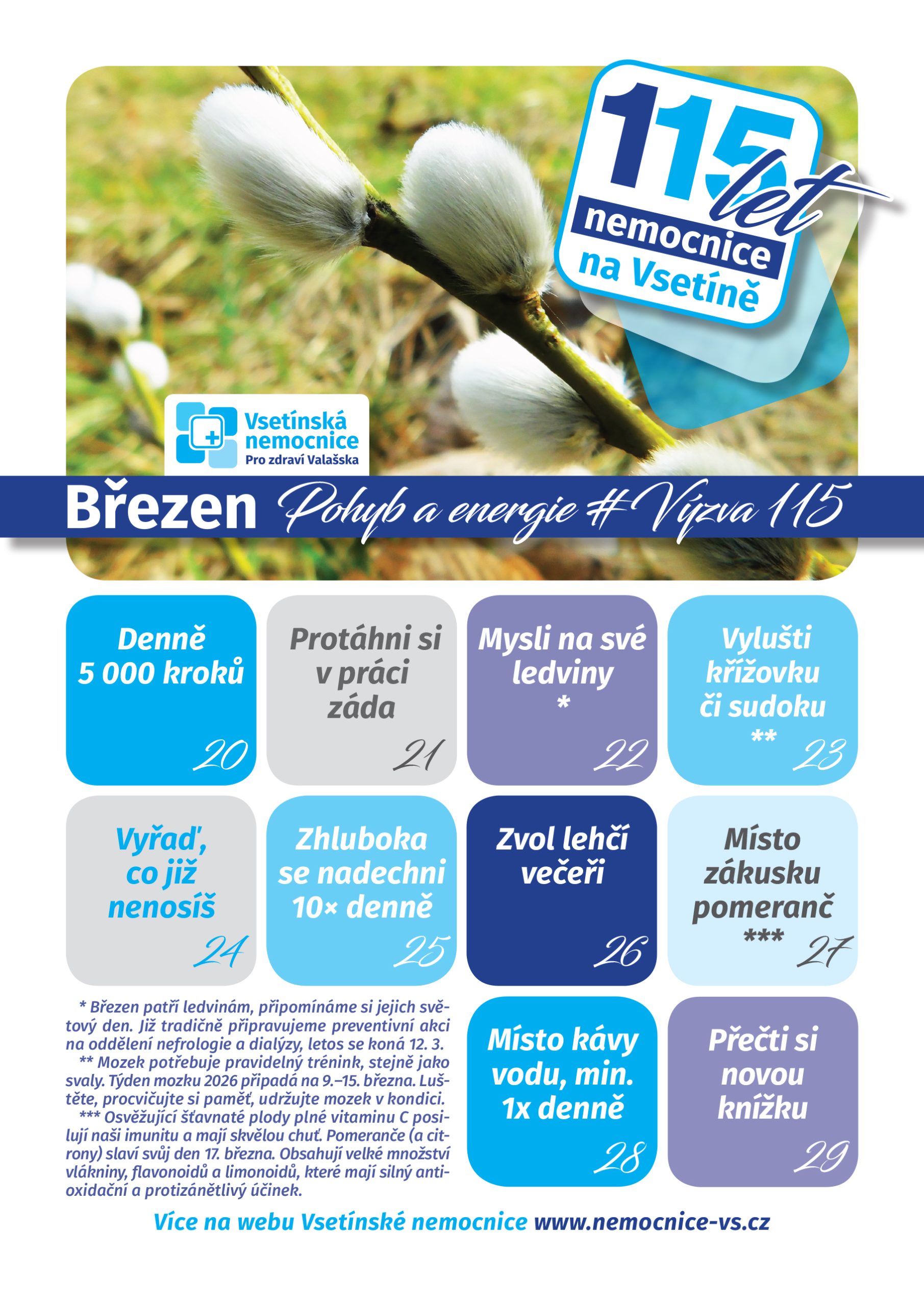 Vsetínská nemocnice letos slaví 115. výročí, číslovka nás inspirovala ke 115 drobným výzvám, jejichž plněním podpoříte své zdraví a dobrou pohodu. Pusťte se do plnění spolu s námi a posílejte nám zprávy, fotografie a zajímavé tipy. Můžete je směřovat na naše sociální profily, ale také na e-mail: soutez@nemocnice-vs.cz.