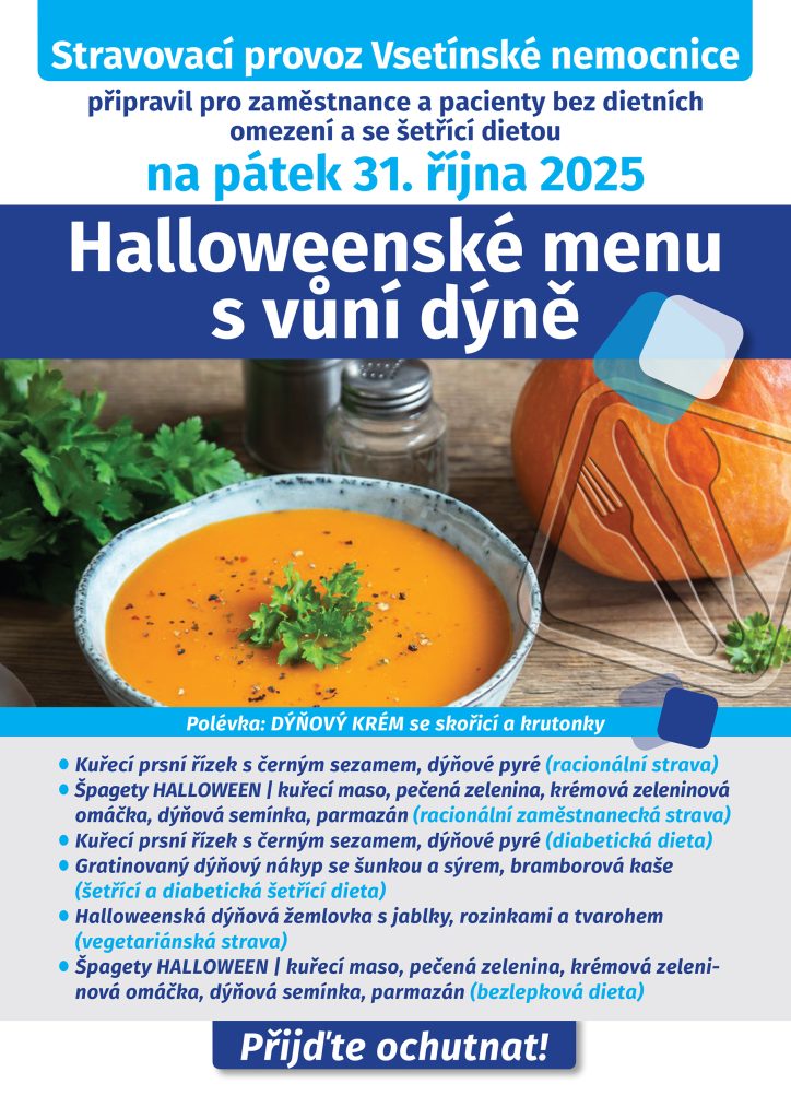 Dýňový krém se skořicí a krutonky, ale také řadu dalších dobrot, inspirovaných podzimními potravinami, připravuje oddělení stravování na pátek 31. října 2025, a to nejen pro zaměstnance, ale také pacienty bez dietních omezení a se šetřící dietou.