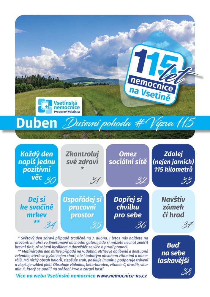 Na duben přinášíme další várku, tentokrát devíti drobných tipů pro zdraví, kondici a dobrou pohodu. Jsou součástí celoroční kampaně Výzva 115, která je inspirována letošním 115. výročím Vsetínské nemocnice. Čtvrtá část je zaměřena na duševní pohodu, ale samozřejmě nezapomínáme ani tentokrát na pohyb a zdravé stravování. Nezapomínejte, že malé radosti z plnění drobných cílů vytváří velkou změnu v myšlení.