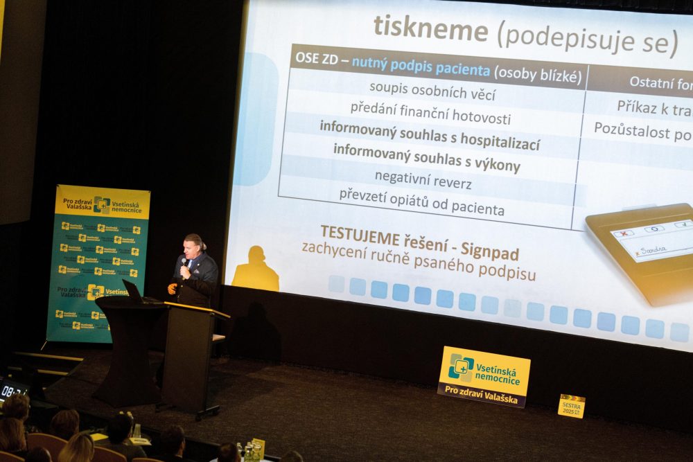 Velký prostor byl věnován další z výzev – elektronizaci a digitalizaci ošetřovatelské dokumentace. „Ve Vsetínské nemocnici jsme začali už poměrně dávno s kompletní listinnou revizí dokumentace, máme dlouhodobě širokou pracovní skupinu, kde jsou vrchní sestry, manažer kvality a další profese. Proběhla implementace nového nemocničního informačního systému, od té doby precizujeme elektronické formuláře. V tuto chvíli prožíváme něco, co by se dalo s nadhledem nazvat konec doby papírové. Snažíme se naplňovat koncept bezpapírové nemocnice, řešíme ještě některé dílčí problémy, ale dalo by se říct, že máme z devadesáti devíti procent ošetřovatelskou dokumentaci elektronizovánu,“ komentoval náměstek pro ošetřovatelskou péči Mgr. Pavel Šupka.