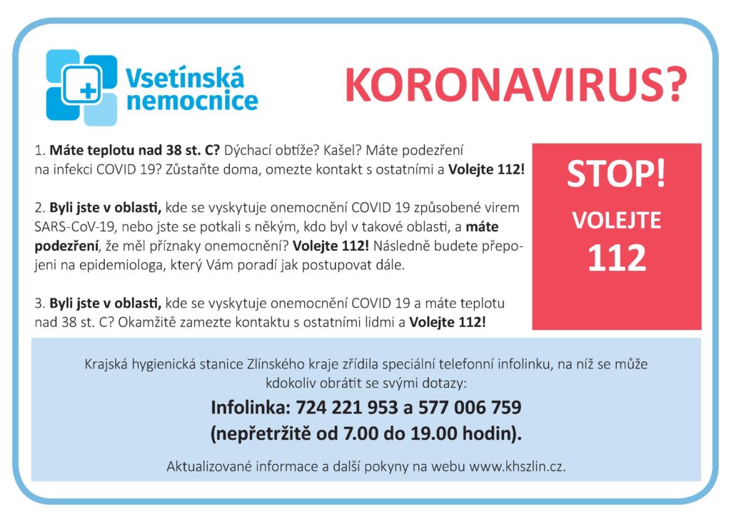 Aktualizace ze dne 5. 3. 2020: S platností od pátku 6. března 2020 až do odvolání platí ve Vsetínské nemocnici zákaz návštěv.