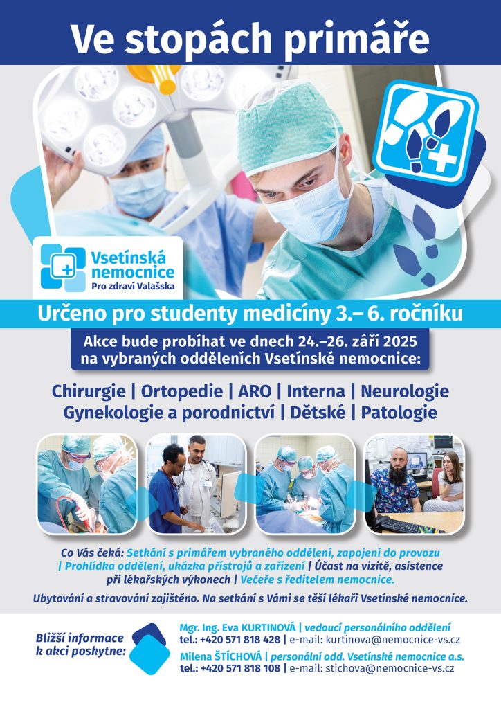 Druhým rokem přijíždějí do Vsetínské nemocnice medici z České republiky i ze Slovenska, aby se zapojili do exkluzivního projektu VE STOPÁCH PRIMÁŘE, který intenzivní formou seznamuje s odbornostmi, pracovišti a týmy zdravotníků. Studenti všeobecného lékařství si tuto formu velmi oblíbili, líbilo se jim včlenění do chodu oddělení, možnost vyzkoušet si práci na operačním sále či v ambulancích. Pochvalovali si vstřícnost zdravotníků, ale také zajištění celého projektu, kdy nemocnice studentům hradí ubytování i stravování.