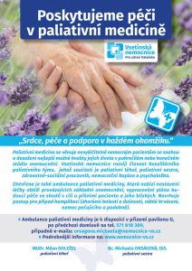 „Vloni jsme se v rámci paliativní péče starali o stovku hospitalizovaných pacientů, padesát jich prošlo ambulancí. Letos je zájem ještě mnohem vyšší,“ uvedl paliativní lékař MUDr. Milan Doležel. Hlavním cílem paliativní péče je zvyšování kvality života nevyléčitelně nemocných pacientů v pokročilém či konečném stádiu jejich onemocnění. Na lůžkových odděleních se paliativní tým věnuje zpravidla terminální paliativní péči. „V ambulanci se snažíme zaměřovat na časnou paliativní péči, která může trvat měsíce i roky, v podstatě od doby, kdy se pacient dozví, že další léčba nepovede k uzdravení, jen budeme léčit jednotlivé obtíže,“ připomenul MUDr. Doležel. V ambulanci je nastavena léčba bolesti, nevolnosti, nespavosti a dalších obtíží, která provázejí základní onemocnění.  Vypracován je plán budoucí péče, kde je zohledněno přání pacienta a pečujících příbuzných, prožití závěru života v pacientem preferovaném prostředí. Péče se zaměřuje nejen na pacienta, ale zohledňuje také přání a možnosti jeho blízkých.
