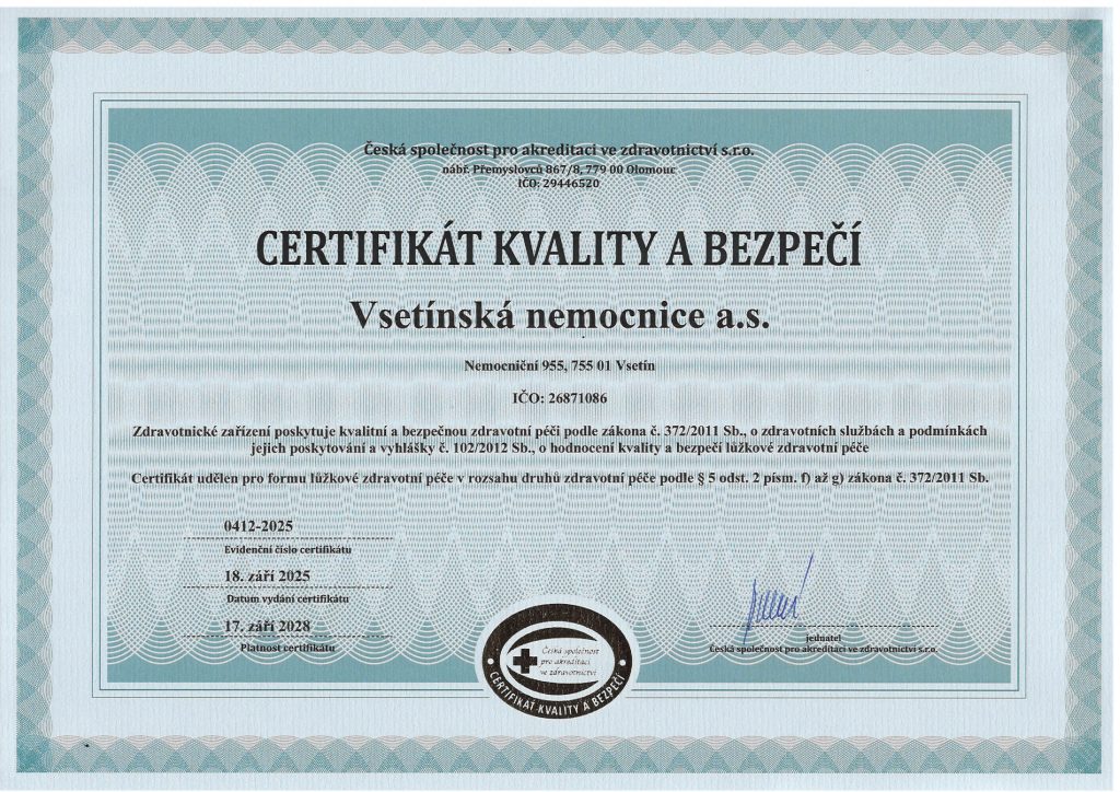 „Úroveň poskytovaných zdravotnických služeb ve Vsetínské nemocnici byla vyhodnocena jako vyhovující ve všech standardech a ukazatelích platné legislativy a nemocnice získala Certifikát kvality a bezpečí s platností na 3 roky,“ potvrdil MUDr. Mgr. Ing. Dalimil Chocholáč, Ph.D., MBA, LLM z České společnosti pro akreditaci ve zdravotnictví, a neformálně připojil: „Krásná práce, hluboce smekám.“