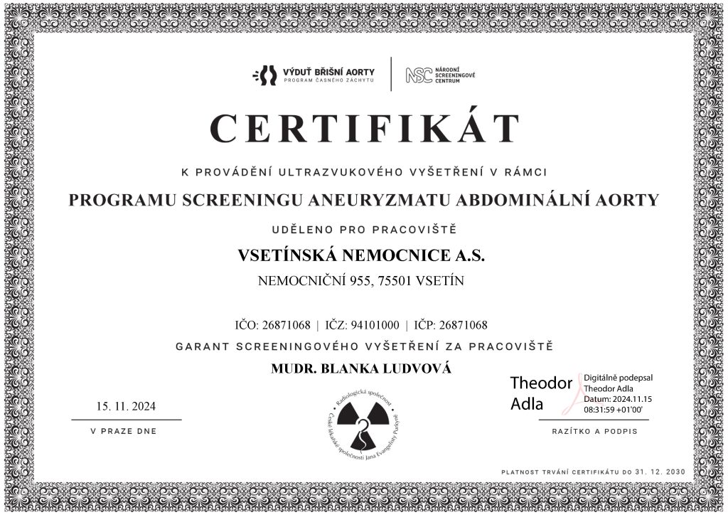 Vsetínská nemocnice se připojuje k novému pilotnímu programu, zaměřenému na screening výdutě břišní aorty, který je určen mužům ve věku od 65 do 67 let. Radiodiagnostické oddělení získalo certifikát k provádění screeningového ultrazvukového vyšetření, zdravotníci i technika jsou připraveni. Vlastní zahájení se očekává v průběhu února.