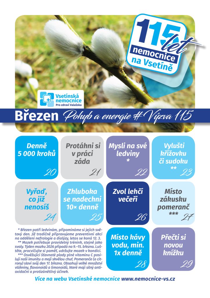Myslete na své ledviny, byl i jeden z dílčích úkolů březnové Výzvy 115. Ta se inspirovala letošním jubileem Vsetínské nemocnice, která si připomíná 115 let péče o zdraví obyvatel valašského regionu. Výzva 115, do které se mohu zapojit zaměstnanci nemocnice, pacienti, spolupracující organizace i široká veřejnost, nabízí 115 drobných úkolů rozprostřených do celého roku, jejichž společným cílem je podpora zdravého životního stylu, prevence, psychické pohody a dobré nálady. Nejde jen o to splnit všechny úkoly, ale věnovat pozornost sobě, zastavit se a udělat malé změny, které mohou mít dlouhodobě velký význam. Jednotlivé výzvy jsou zveřejňovány postupně na webových stránkách nemocnice – zájemci je mohou sdílet elektronicky, nebo si je vytisknout, připnout na nástěnku či ledničku a s radostí si odškrtávat splněné úkoly.