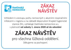 Vzhledem k vzestupu počtu nemocných s akutními respiračními infekcemi a na základě doporučení Krajské hygienické stanice Zlínského kraje vyhlašuje Vsetínská nemocnice a.s. s platností od 1. 2. 2020 až do odvolání ZÁKAZ NÁVŠTĚV pro všechna lůžková oddělení. Děkujeme za pochopení a žádáme o respektování.