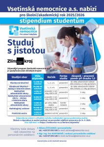 Vsetínská nemocnice a.s. nabízí stipendium ve výši 20.000 Kč/měsíčně pro studenty/tky 4., 5. a 6. ročníku oboru Všeobecné lékařství/Všeobecné lekárstvo v ČR nebo na Slovensku. Stipendium je možné získat i v dřívějším ročníku. Získání stipendia je podmíněno závazkem pracovat v pracovním poměru ve Vsetínské nemocnici a.s. v interním oboru (tj. ve specializačním oboru se základním kmenem interním nebo neurologickým) do doby absolvování základního kmene specializačního oboru a dále minimálně po dobu dalších dvou let po jeho získání. Individuální úprava podmínek je možná. - NELÉKAŘSKÉ ZDRAVOTNICKÉ OBORY – prezenční forma studia